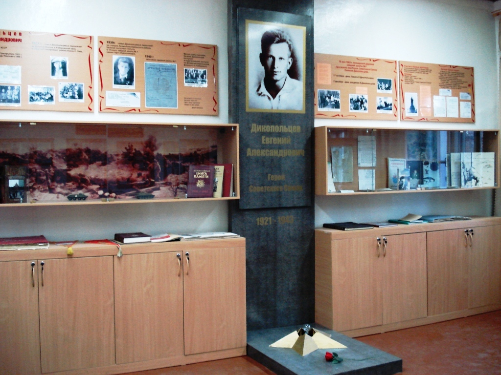 музея – 15.02.1973 Сертификат о включении в реестр музеев образовательных организаций >>> Память о своём выпускнике Евгении Дикопольцеве гимназии №1 хранит уже более 79-ти лет. В 60-е годы прошлого столетия началась поисковая работа по изучению биографии героя, и уже 18 мая 1963-го года пионерской дружине средней школы №1 присвоили имя Героя Советского Союза Евгения Дикопольцева. Тогда и родилась идея создания при школе музея героя-земляка, которая была успешно претворена в жизнь. Первый в Комсомольске-на-Амуре школьный музей в честь Героя Советского Союза открылся 15 февраля 1973-го года, его создателем стала Людмила Никифоровна Глушко, которая проработала в школе№1 почти полвека! Евгений Александрович Дикопольцев родился в 1921 году в Мордовии — в городе Ардатове. Когда ему исполнилось семь лет, семью выслали на Дальний Восток. Отца Евгения - Александра Павловича, служившего в Ардатове лесником, раскулачили и приговорили к ссылке. Новый адрес семьи — участок Кедрач Оборского леспромхоза ДВЖД. Здесь Женя начал учиться, вступил в пионеры и даже стал отрядным барабанщиком. Но учиться в школе участка Кудрач до самого выпуска Евгению не довелось: в 1938 году после событий на озере Хасан в Приморье, когда Красная Армия остановила продвижение японцев вглубь советской территории, для усиления государственной безопасности было решено выселить из приграничных районов семьи бывших кулаков. Так Дикопольцевы оказались в поселке Хумми недалеко от Комсомольска-на-Амуре. Аттестат зрелости Евгений получал в городской школе №1. В 1940 году в числе лучших выпускников (из статьи газеты "Комсомольск 1940г.) легко поступает в Хабаровский пединститут на физико-математический факультет. Закончить вуз Евгению так и не довелось: началась Великая Отечественная война, и в феврале 1942 года Евгений ушёл в армию добровольцем. В ходе боёв под Курском Дикопольцев получил звание сержанта. Он участвовал в освобождении Белгорода и Харькова и был удостоен медали «За отвагу». Был ранен в голову. После госпиталя снова попал служить в родной полк. В ночь на 26 сентября 1943 года его подразделение форсирует Днепр, создав на правом берегу Бородаевский плацдарм. В ожесточенных боях с 5 по 17 октября Евгений Дикопольцев постоянно был на линии огня, восстанавливая связь 1-ого батальона, на участке которого шли беспрерывные ожесточённые бои, со штабом стрелкового полка. И вот последний выход на линию: 17 октября 1943 года, устраняя очередное повреждение, осколками от разрыва вражеского снаряда Евгений был тяжело ранен в ногу и правое плечо. От большой потери крови руки не слушались. Теряя сознание, он соединил концы проводов и зажал их зубами. Связь была восстановлена. Наша артиллерия, получив переданные координаты, повела огонь по наступающим танкам, а гвардейские миномёты, по скопищам вражеской пехоты. Фашисты были вынуждены отступить. Товарищи вынесли Евгения с поля боя без сознания. Не пришёл он в себя и на операционном столе полевого госпиталя. 18 октября 1943 года гвардии сержант Евгений Дикопольцев скончался. С воинскими почестями он был похоронен на высоком берегу Днепра у села Старый Орлик. Позднее останки его были перенесены и перезахоронены в братской могиле в селе Радянское Кобылянского района Полтавской области. Командование 235-го гвардейского стрелкового полка, в котором с пер